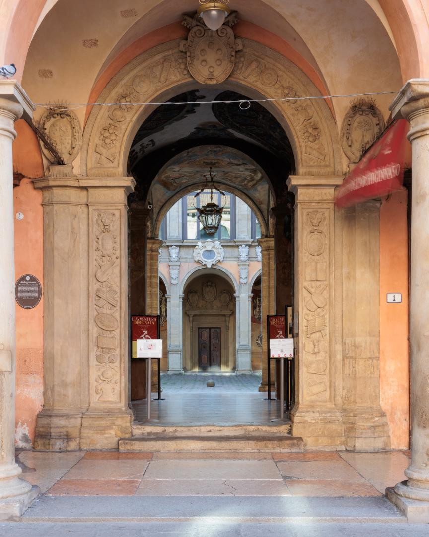 La trasformazione cinquecentesca che coinvolge l’intero complesso architettonico si deve, dunque, alla volontà del Papa di dare una sede degna allo Studio bolognese, quando, per questioni economiche, già si era abbandonata l’idea di ampliare San Petronio fino ad occupare l’area delle Scuole. La nuova sede dell’Università, parte di un insieme di iniziative messe in esecuzione dal vicelegato Cesi, uniforma e ingrandisce le preesistenze centrando il complesso attorno ad un ampio cortile che disimpegna le aule minori e le due maggiori ai due estremi della lunga manica: l’una, verso piazza Maggiore, antica Aula Magna degli artisti, oggi ospita la sala di lettura della biblioteca, mentre l’altra, un tempo Aula Magna dei legisti, al lato opposto verso via Farini, attualmente è conosciuta come sala dello Stabat Mater (in memoria della prima esecuzione pubblica qui tenutasi dell’omonima composizione di Gioachino Rossini) ed ospita conferenze e convegni.