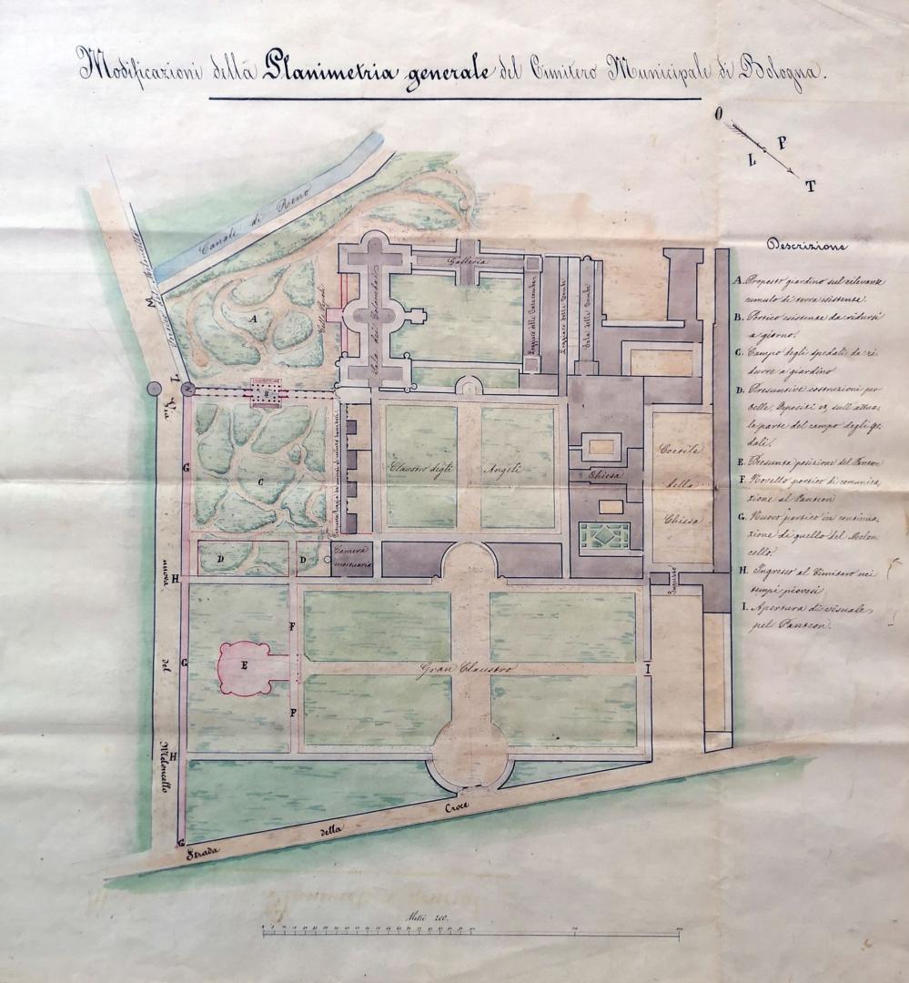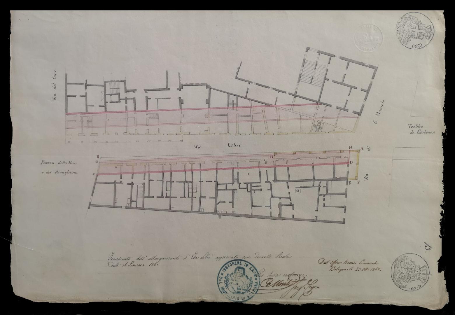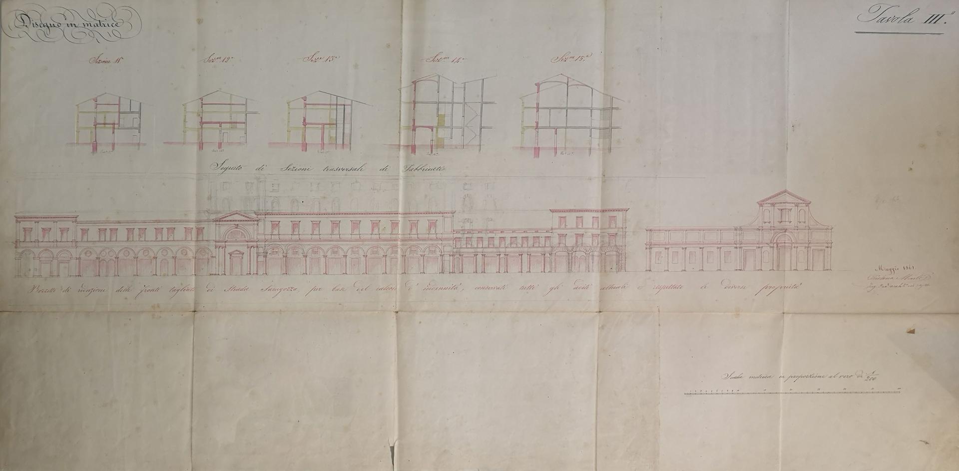 La ricerca storico-architettonica sugli anni bolognesi di Monti è stata grandemente facilitata dalla fortunata conservazione di un cospicuo patrimonio di suoi disegni autografi, conservati all’Archivio di Stato di Perugia. Fortunatamente, questi disegni (forse per le loro grandi dimensioni) furono ceduti dalla famiglia e nel corso del Novecento raccolti da uno storico perugino, Ottorino Gurrieri; alla morte di quest’ultimo, furono depositati in quella sede. Questi disegni non erano mai stati pubblicati su vasta scala. Erano però già noti per esempio a Giuliano Gresleri che ne fece esporre alcuni nel corso della mostra Norma e Arbitrio, organizzata per le celebrazioni di Bologna capitale della cultura del 2000. In occasione dei festeggiamenti per i 150 anni dell’Unità d’Italia ho avuto la fortuna di consultarli per intero e di esporne diverse riproduzioni in una piccola mostra curata dall’Associazione Dimore Storiche Italiane. Se i disegni di Monti sono ancora consultabili (anche se in alcuni casi meriterebbero un lavoro di restauro), le carte più personali di Monti rimasero invece in mano alla famiglia e se ne sono perse le tracce alla morte improvvisa dell’ultima discendente, Rita Monti (che peraltro si era dedicata alla ricerca storica e allo studio del suo illustre antenato): si tratta di una perdita abbastanza grave, ma non dispero che in futuro questo ulteriore fondo di documenti possa riemergere. Naturalmente, è stato importante anche studiare la documentazione conservata presso l’Archivio Storico del Comune di Bologna, che per gli anni postunitari è particolarmente ricca in disegni, lettere, relazioni, verbali del consiglio comunale: tutto questo materiale permette di far emergere il pensiero progettuale di Monti e le sue idee di gestione urbana.