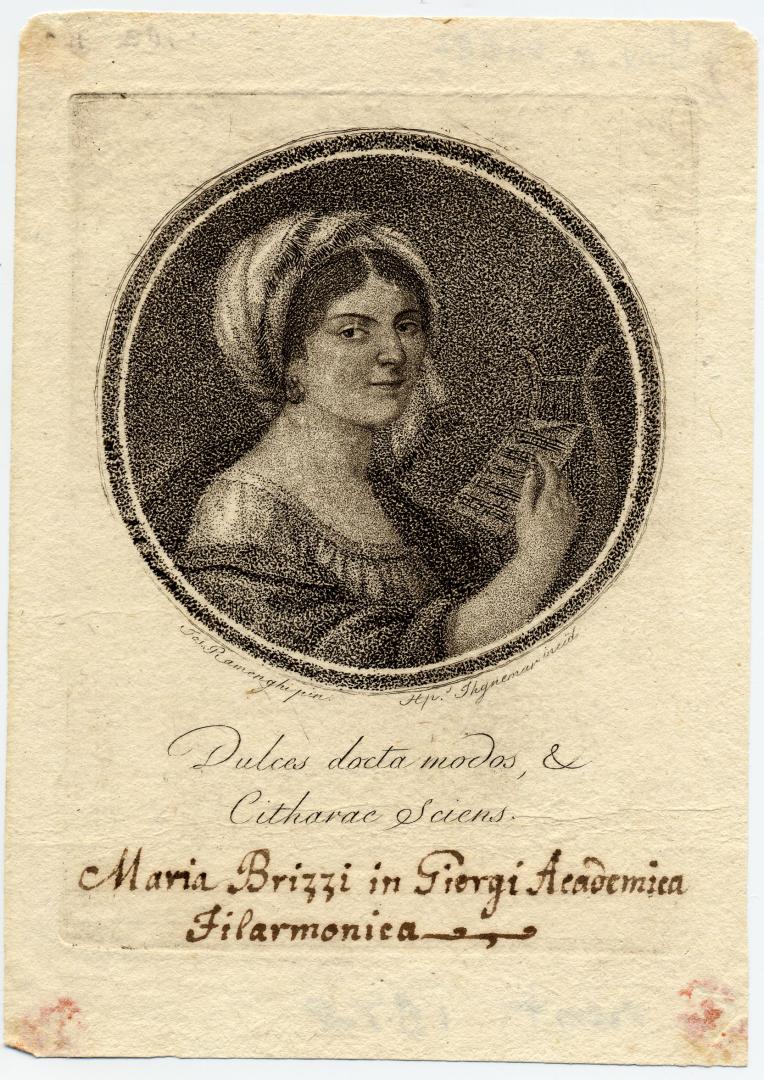 Avevo letto, sul “Giornale del Dipartimento del Reno” del 14 gennaio 1812, il lungo e struggente articolo che Francesco Tognetti aveva scritto in morte di Maria Brizzi Giorgi. Lo scrittore rivela a un certo punto che “Filippo Gargagli” (Filippo Gargalli) l’aveva ritratta nel 1806, dopo la sua aggregazione all’Accademia Filarmonica. Con questa notizia mi sono recato al Museo della Musica sperando di poterlo vedere, ma il ritratto non risultava presente: l’unica immagine che la ritraeva era data da un piccolo ritratto inciso in rame, databile ai primi anni dell’Ottocento. Poco più tardi però, ho ricevuto via mail, dal bibliotecario del museo, Alfredo Vitolo, le fotografie dei ritratti femminili presenti, ma che non erano ancora stati attribuiti. Identifico così Maria Brizzi Giorgi nel ritratto schedato come “ignota suonatrice di liuto di autore anonimo”. A seguito di questa segnalazione gli esperti hanno avviato ulteriori indagini, che hanno poi confermato l’identificazione.