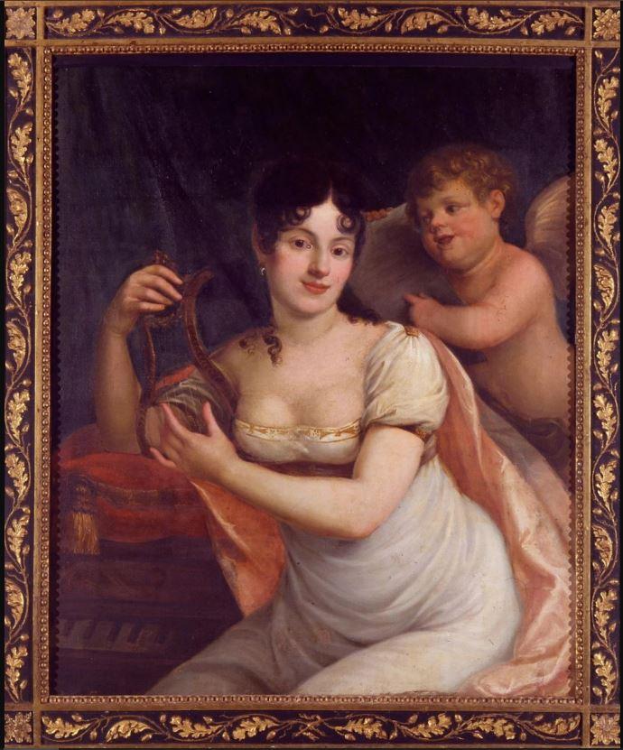 È un ritratto insolito, perché alle spalle della musicista fa capolino un angioletto che ha in mano un foglio pentagrammato e che indica con un dito l’assenza di note sul rigo musicale: è il suo modo per informarci del fatto che quella musicista è una compositrice “all’improvviso”. L’angioletto viene qui utilizzato come attributo allegorico, espediente pittorico consueto nell’iconografia dei santi, molto più insolito in quella musicale dell’Ottocento.
